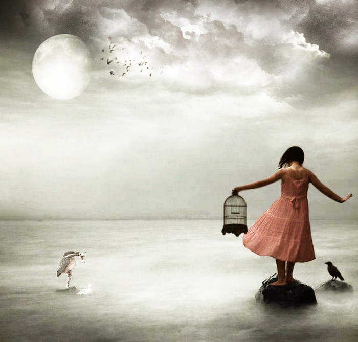 Her hair grows and shrinks. She screams at me until I turn away and draw bird cages, gold like her’s, on white canvas paper. I hold up a blank slate for her and she draws cages too. We laugh and I slide my fingers into the cage to find hers… dissolving into me.